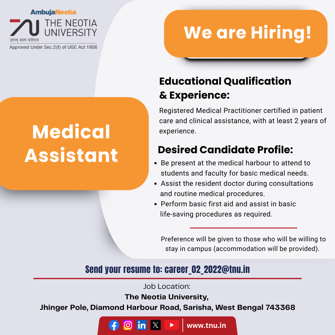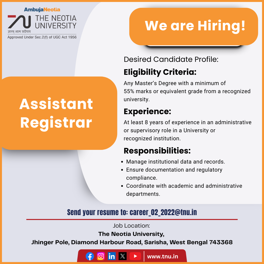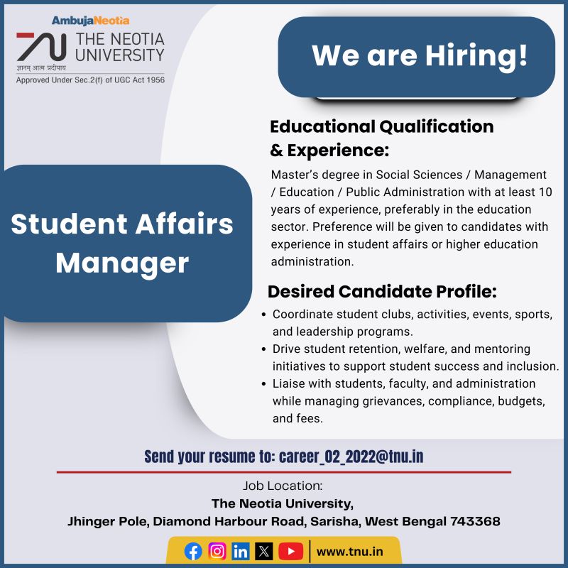 Job Location: The Neotia University, Jhinger Pole, Diamond Harbour, Sarisha, West Bengal, 743368