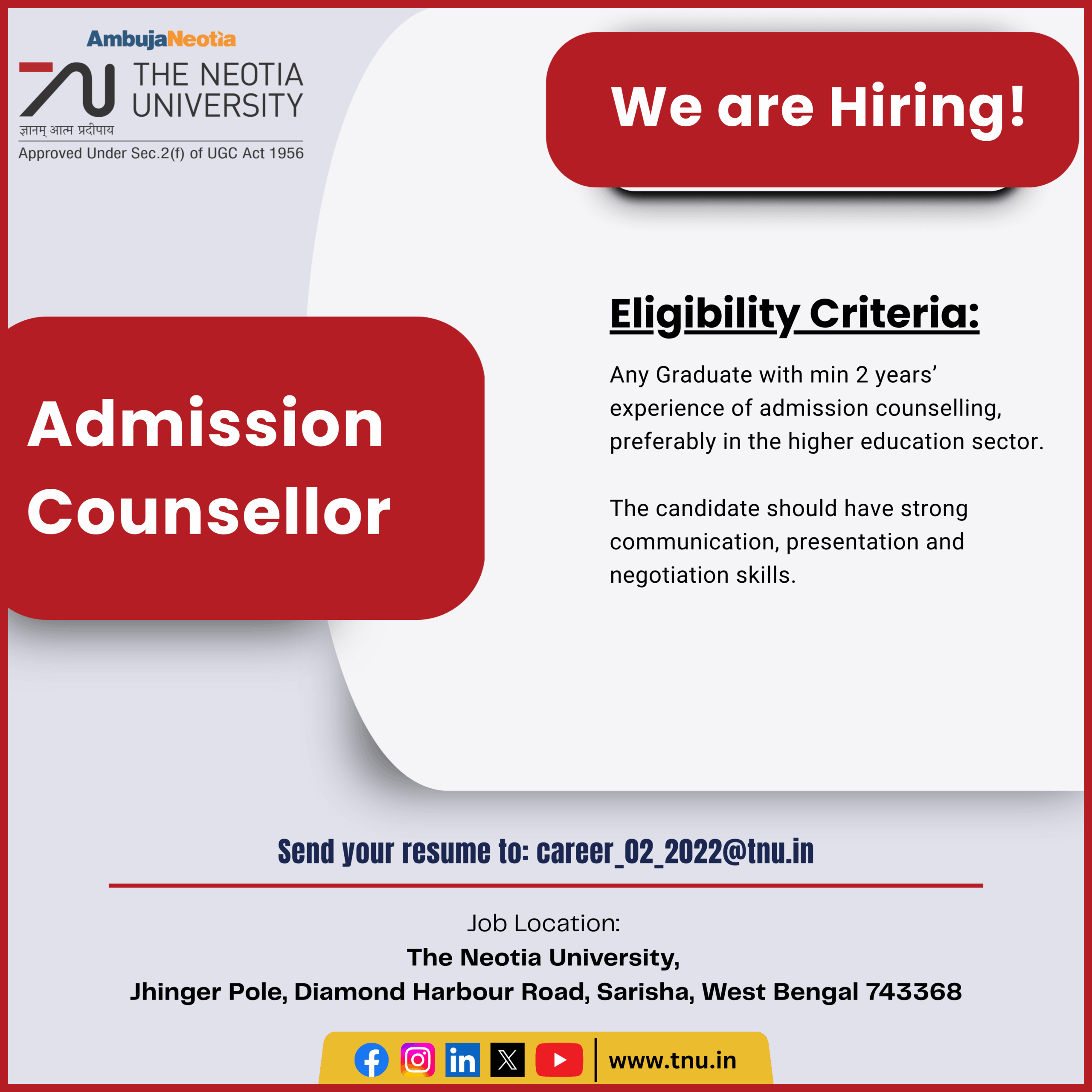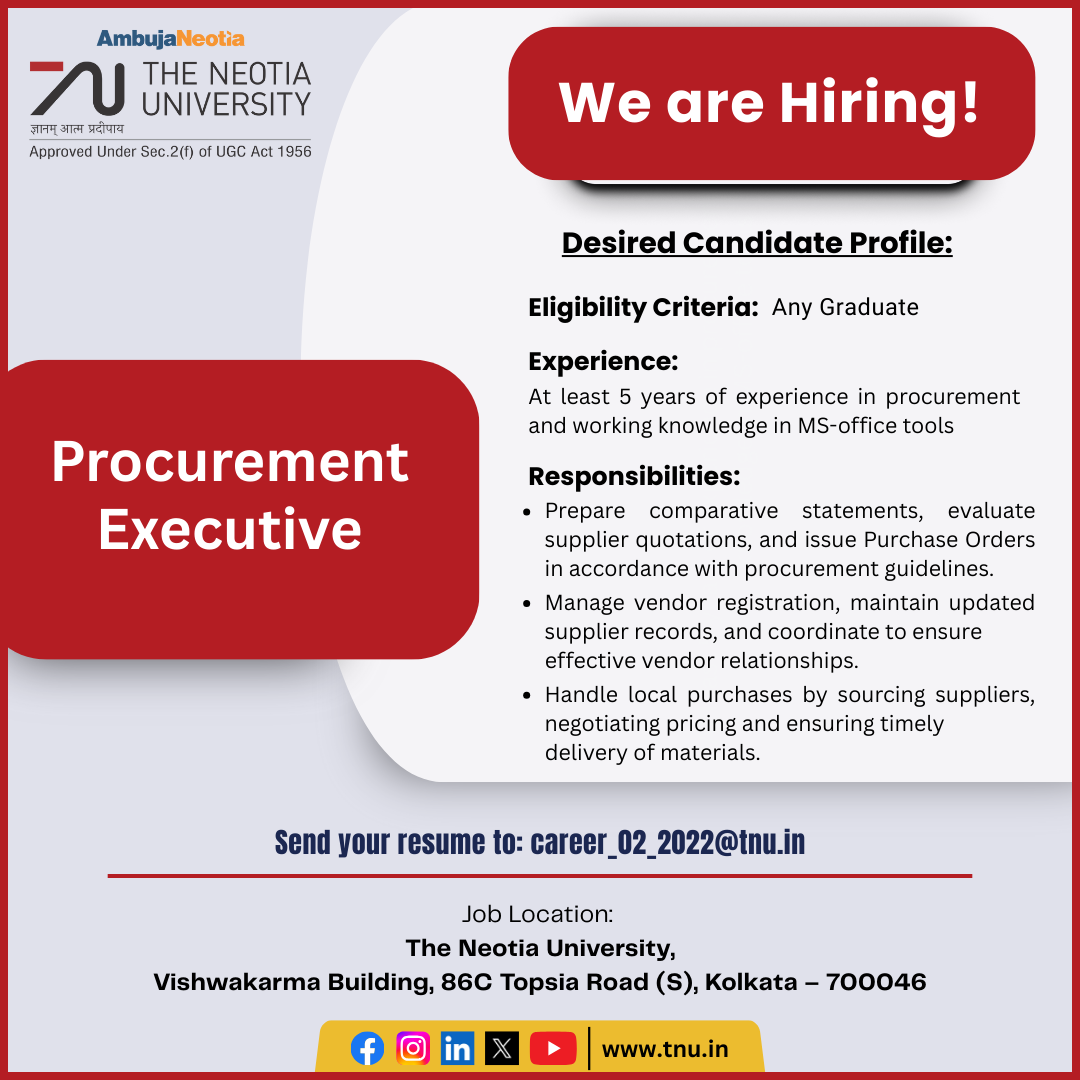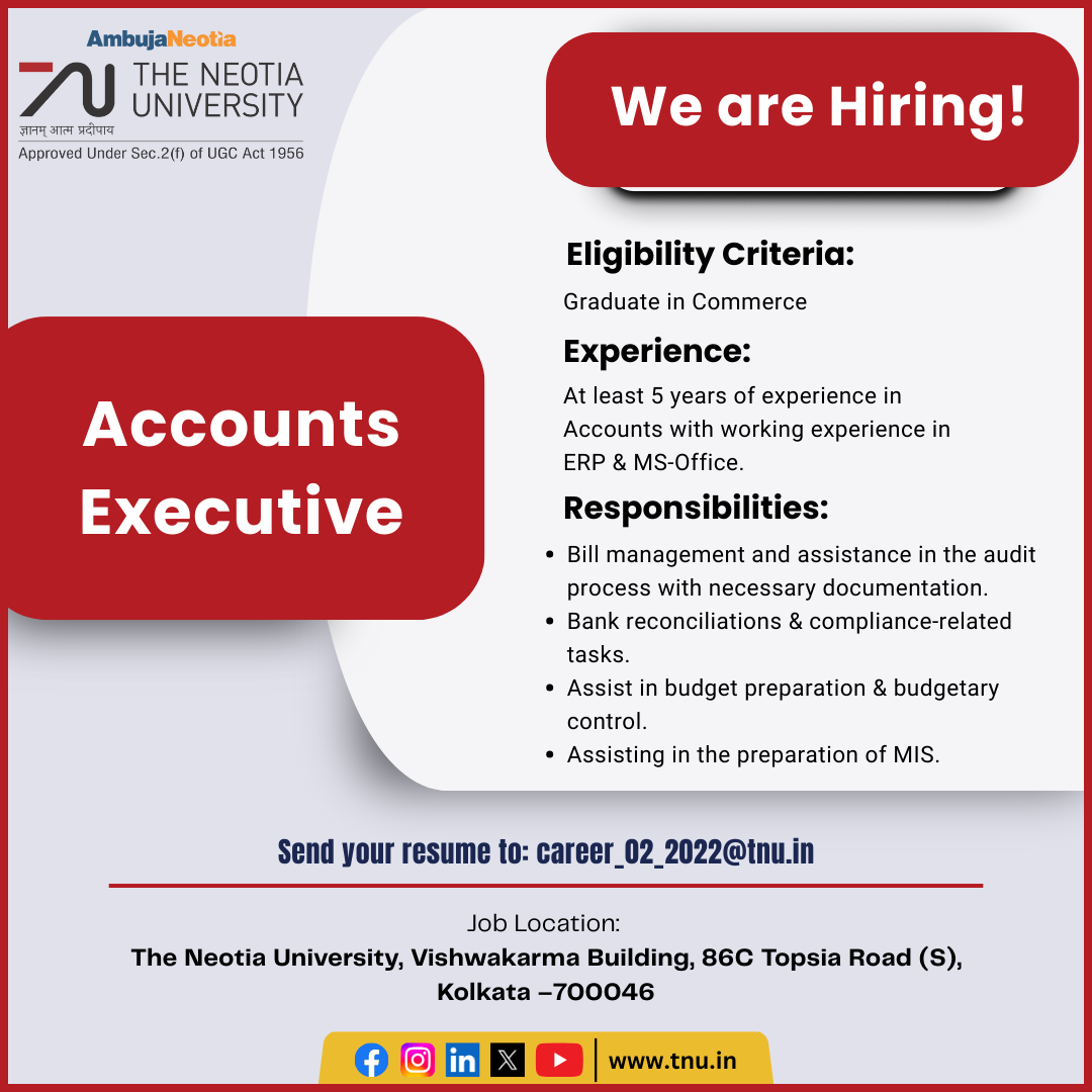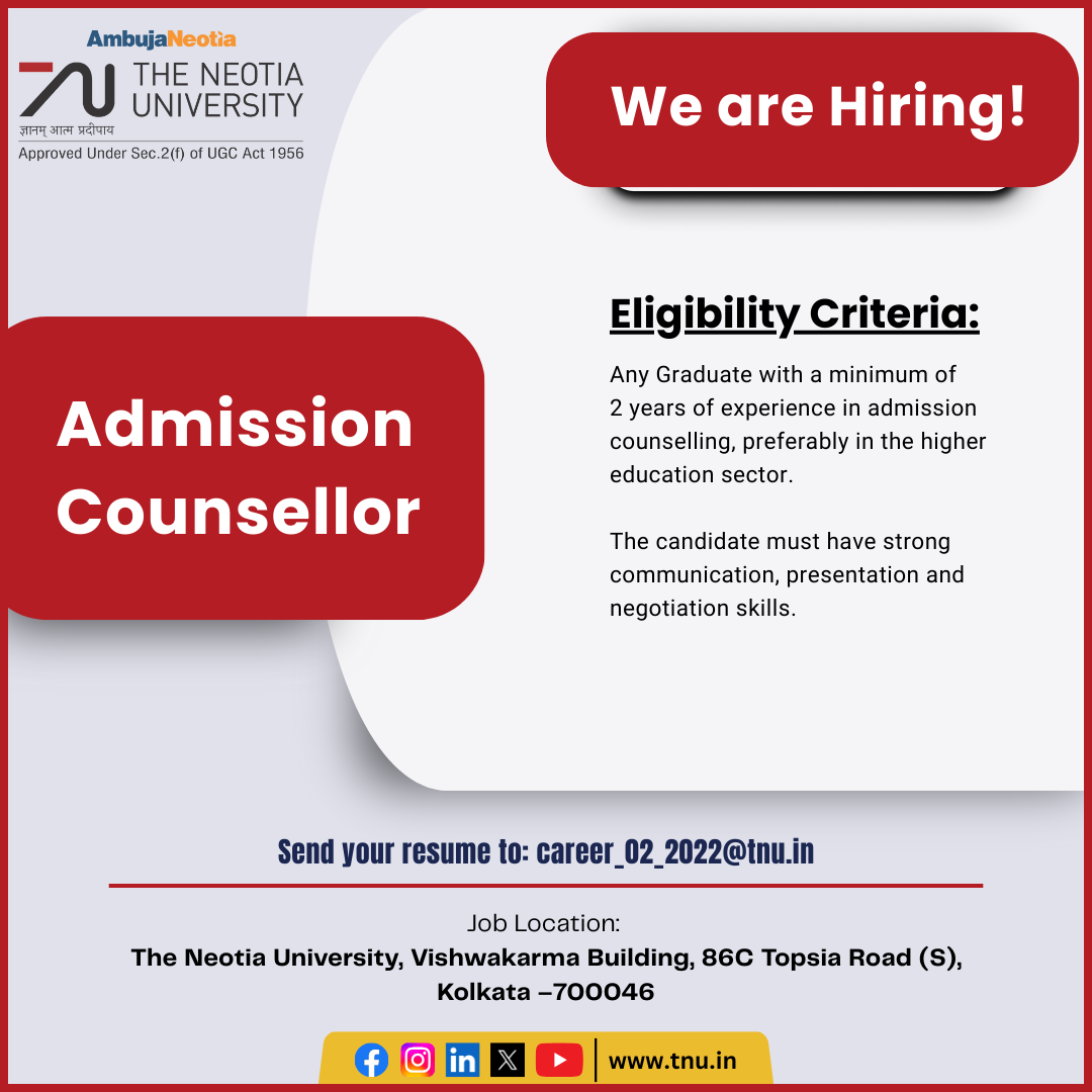 Job Location: The Neotia University, Vishwakarma Building, 86C Topsia Road (S), Kolkata – 700046