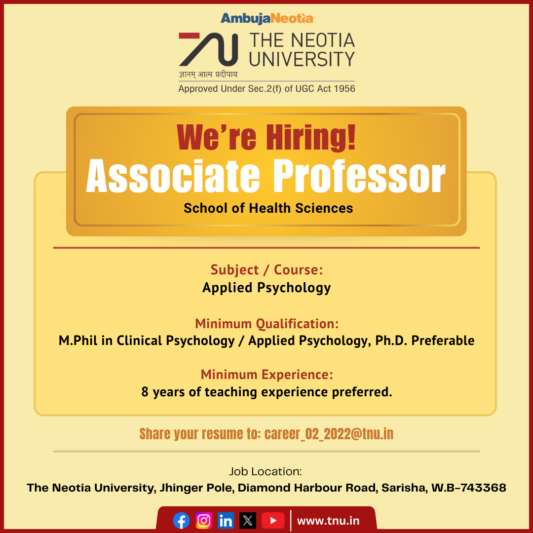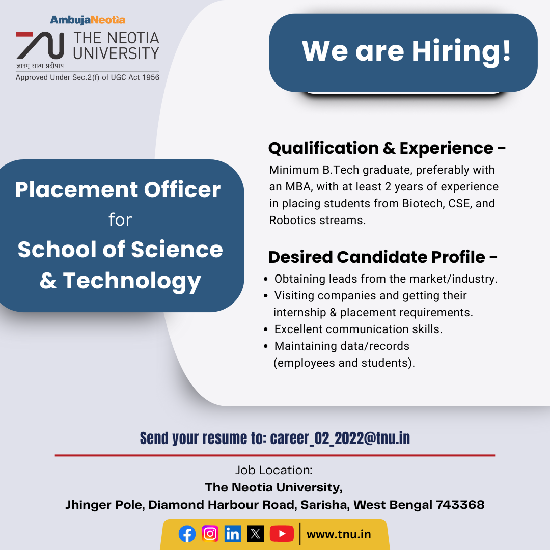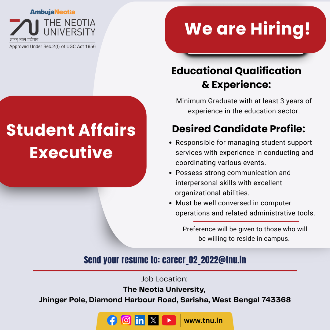 Job Location: The Neotia University, Jhinger Pole, Diamond Harbour Road, Sarisha, West Bengal 743368.