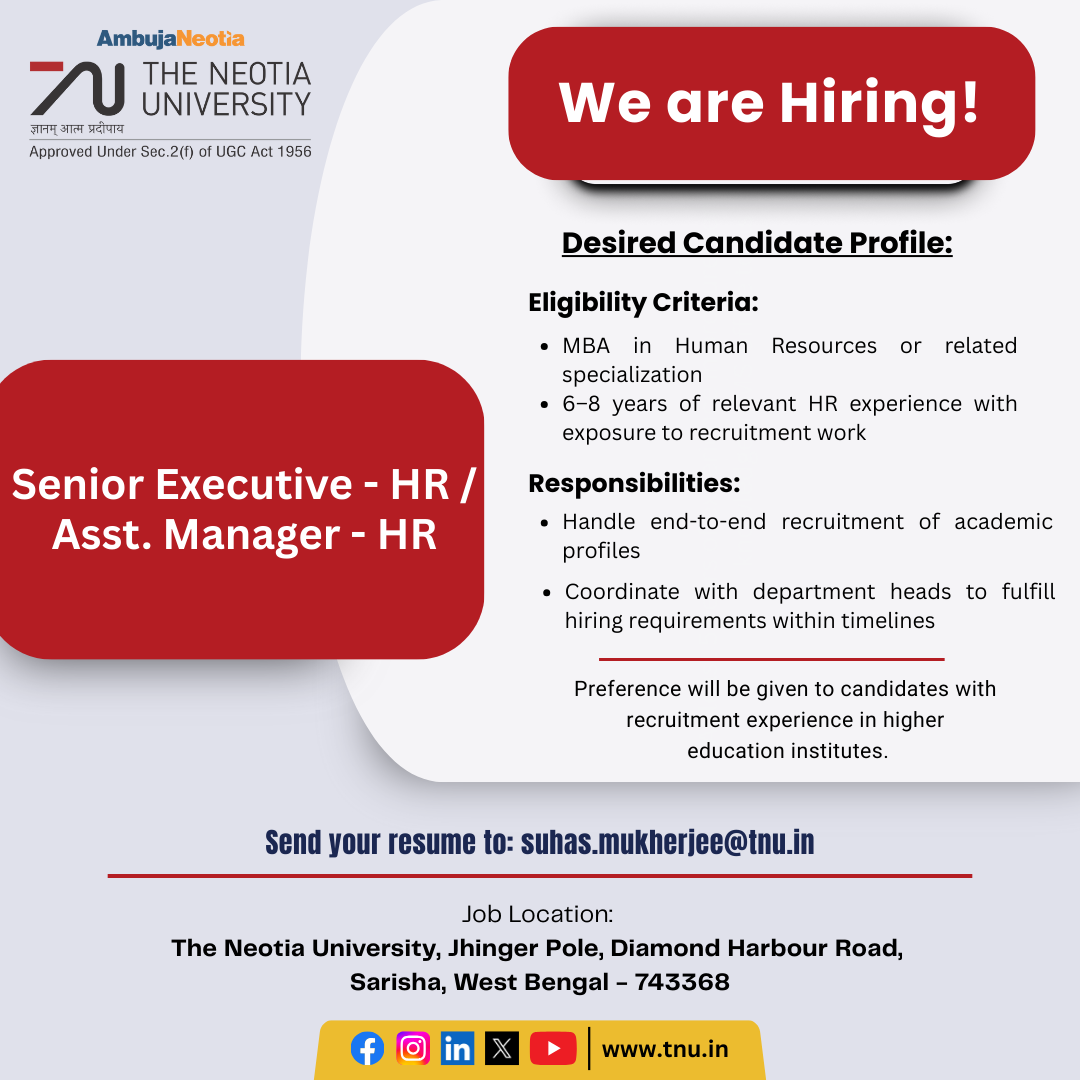 Job Location: The Neotia University, Jhinger Pole, Diamond Harbour Road, Sarisha, West Bengal 743368