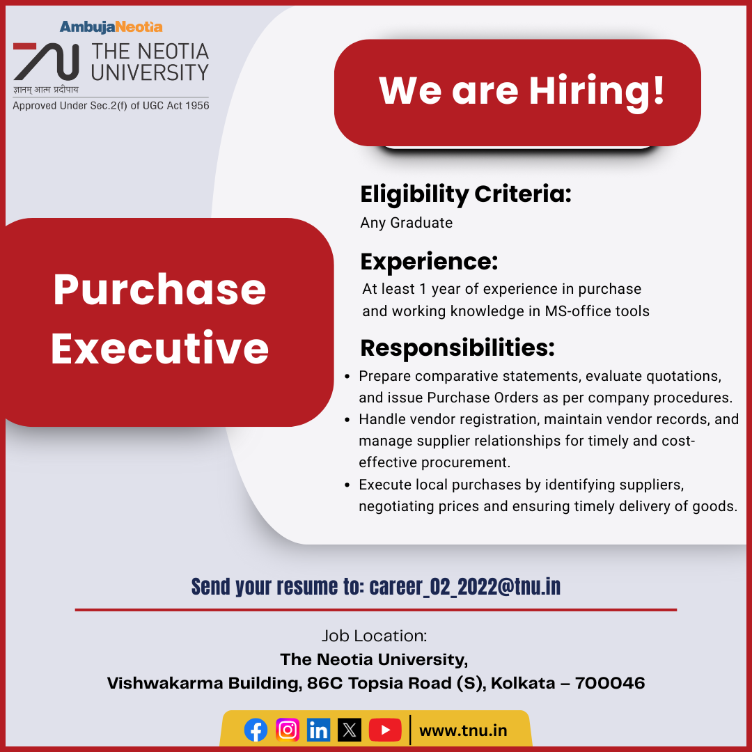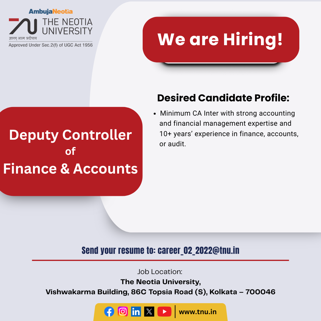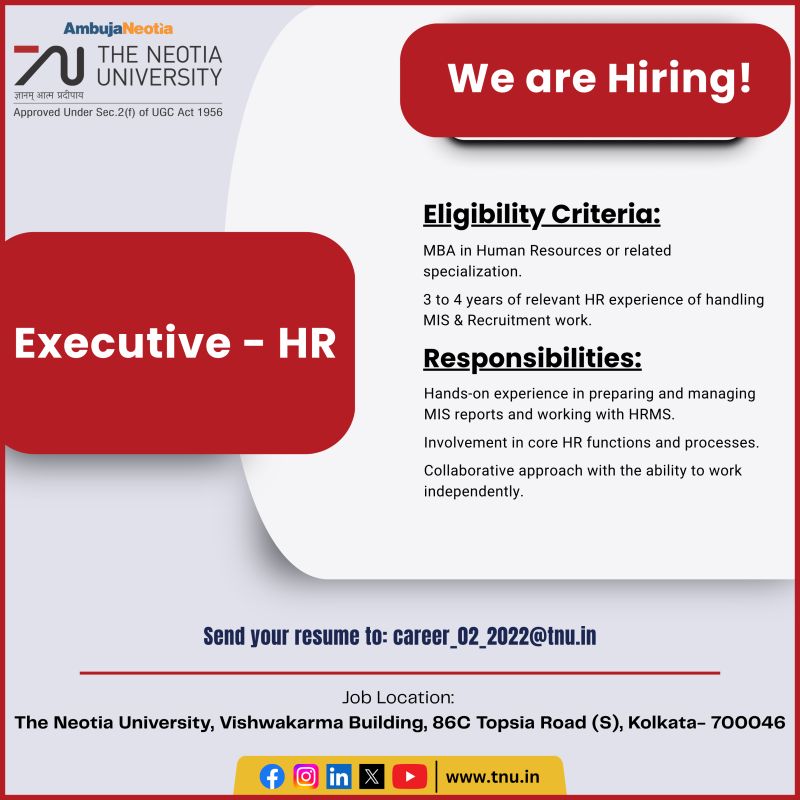 Job Location: The Neotia University, Vishwakarma Building, 86C Topsia Road (S), Kolkata – 700046