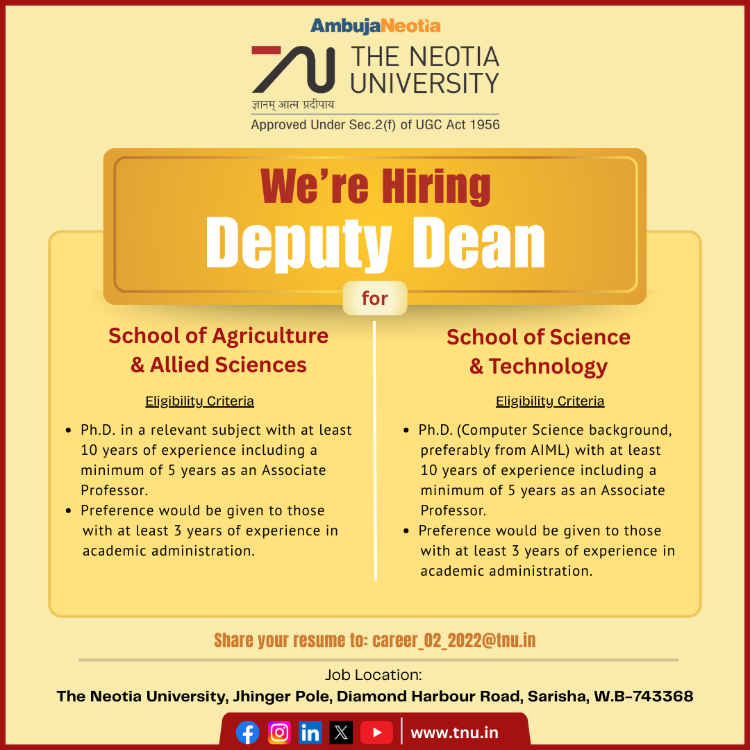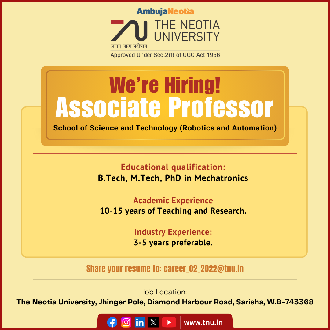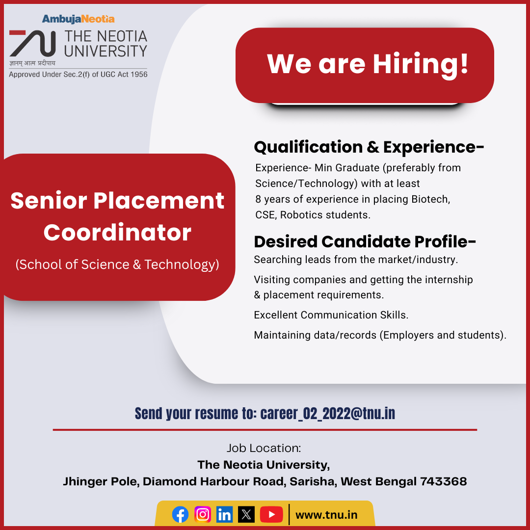 Job Location: The Neotia University, Jhinger Pole, Diamond Harbour Road, Sarisha, West Bengal 743368