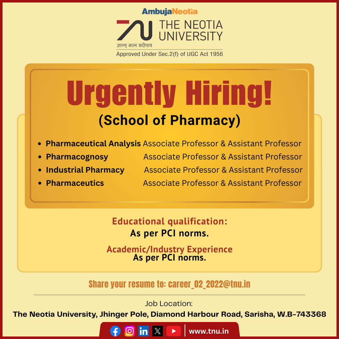Hiring for: Pharmaceutical Analysis, Pharmacognosy, Industrial Pharmacy & Pharmaceutics