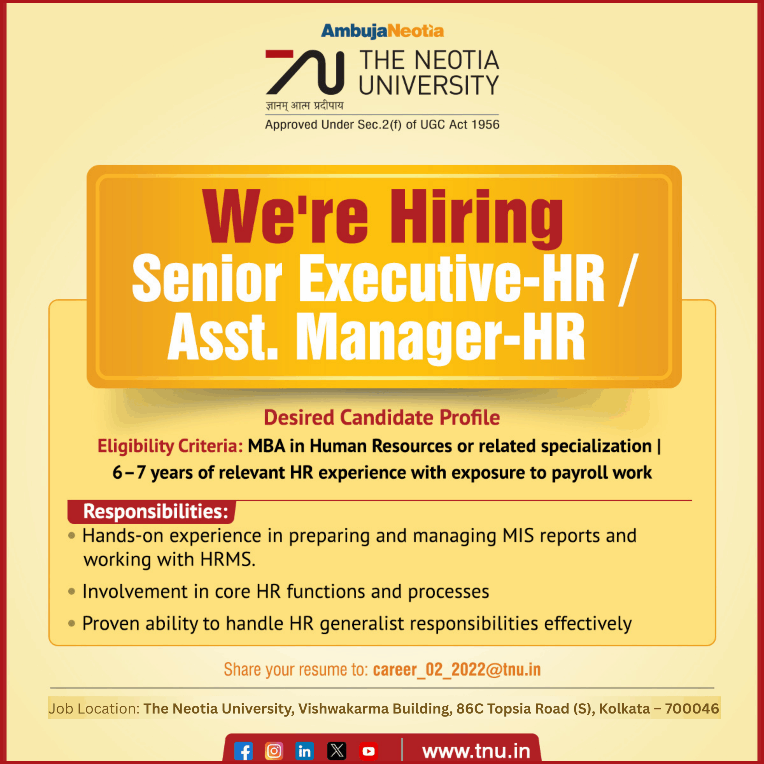 Job Location: The Neotia University, Vishwakarma Building, 86C Topsia Road (S), Kolkata – 700046
