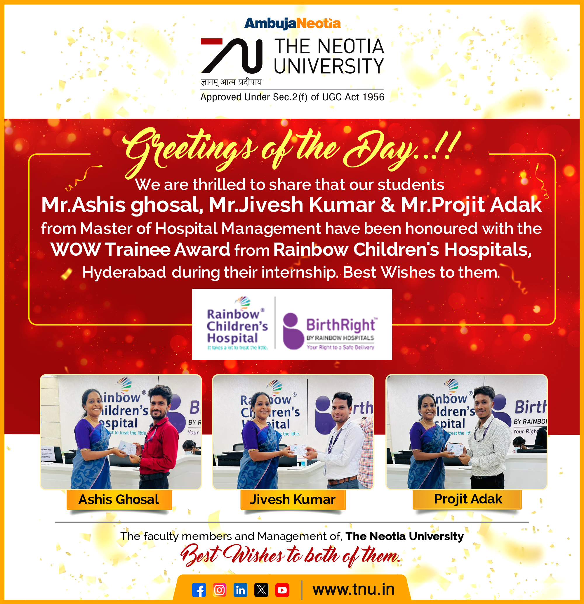 Congratulations- TNU students honoured with WOW Trainee Award from Rainbow Children’s Hospital, Hyderabad