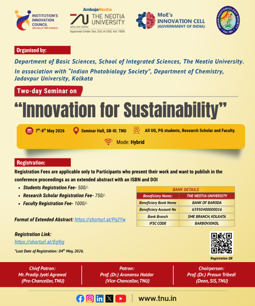 Two-Day Seminar organized by the Department of Basic Science, School of Integrated Sciences, scheduled to be held on 7th and 8th May 2026. In association with “Indian Photobiology Society”, Department of Chemistry, Jadavpur University,Kolkata.