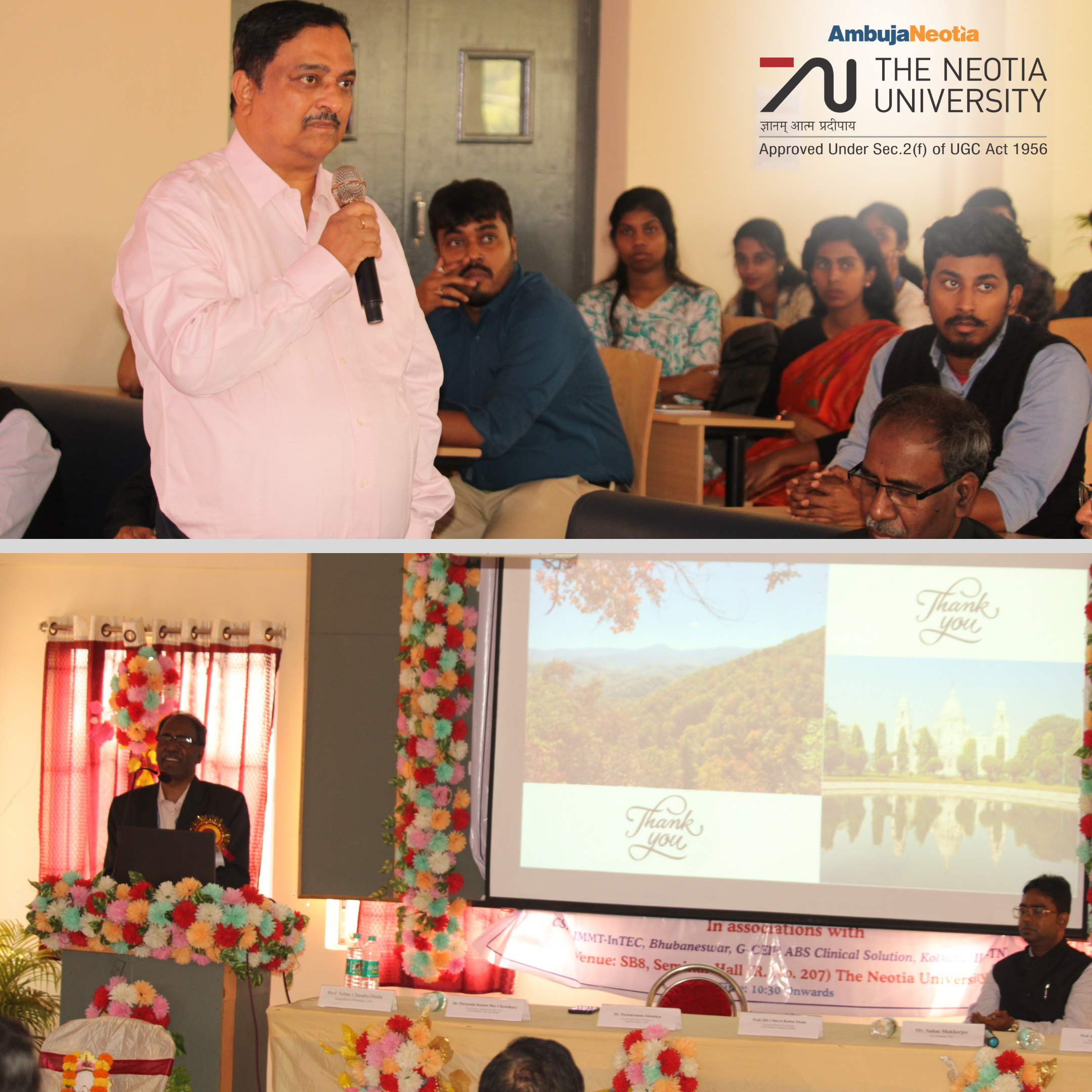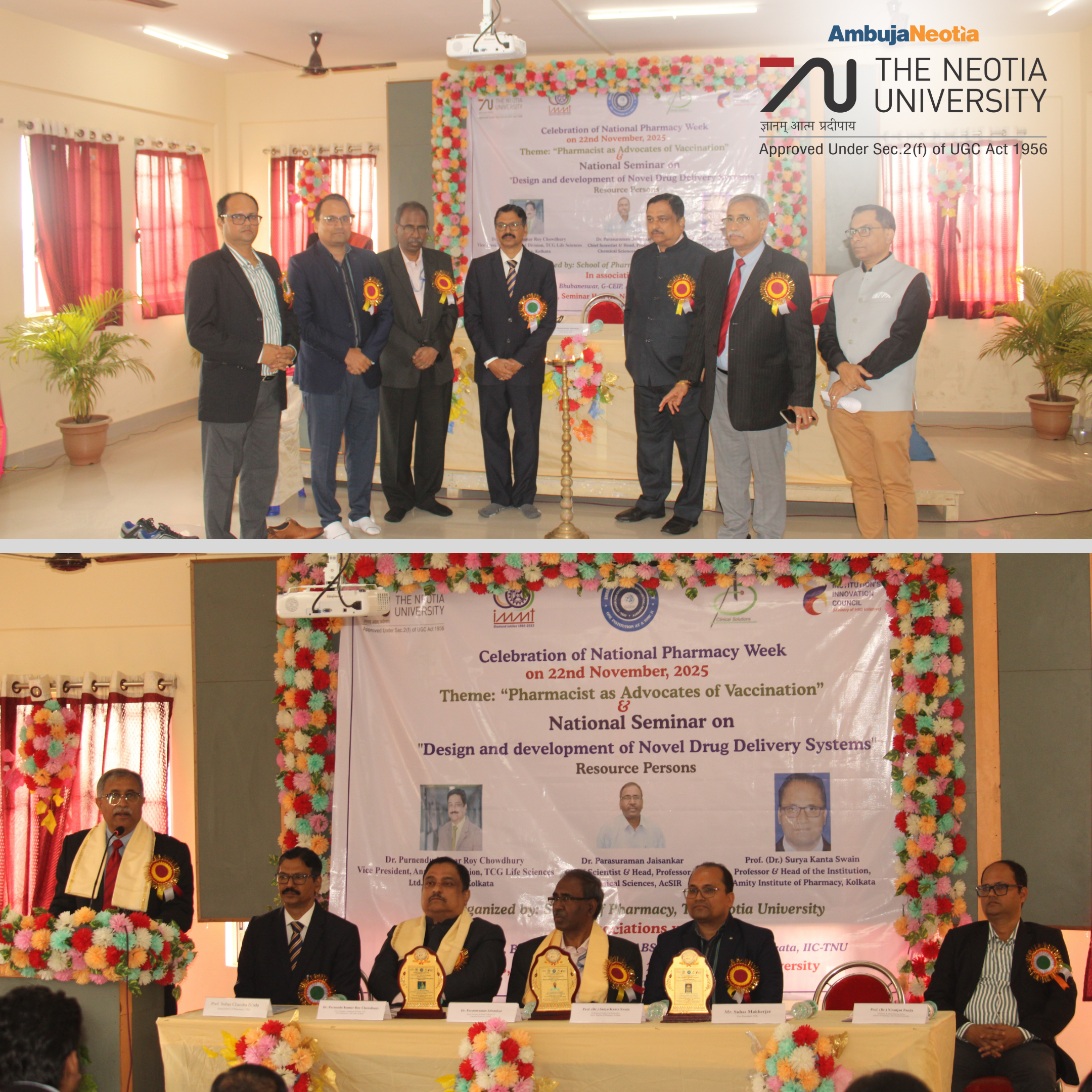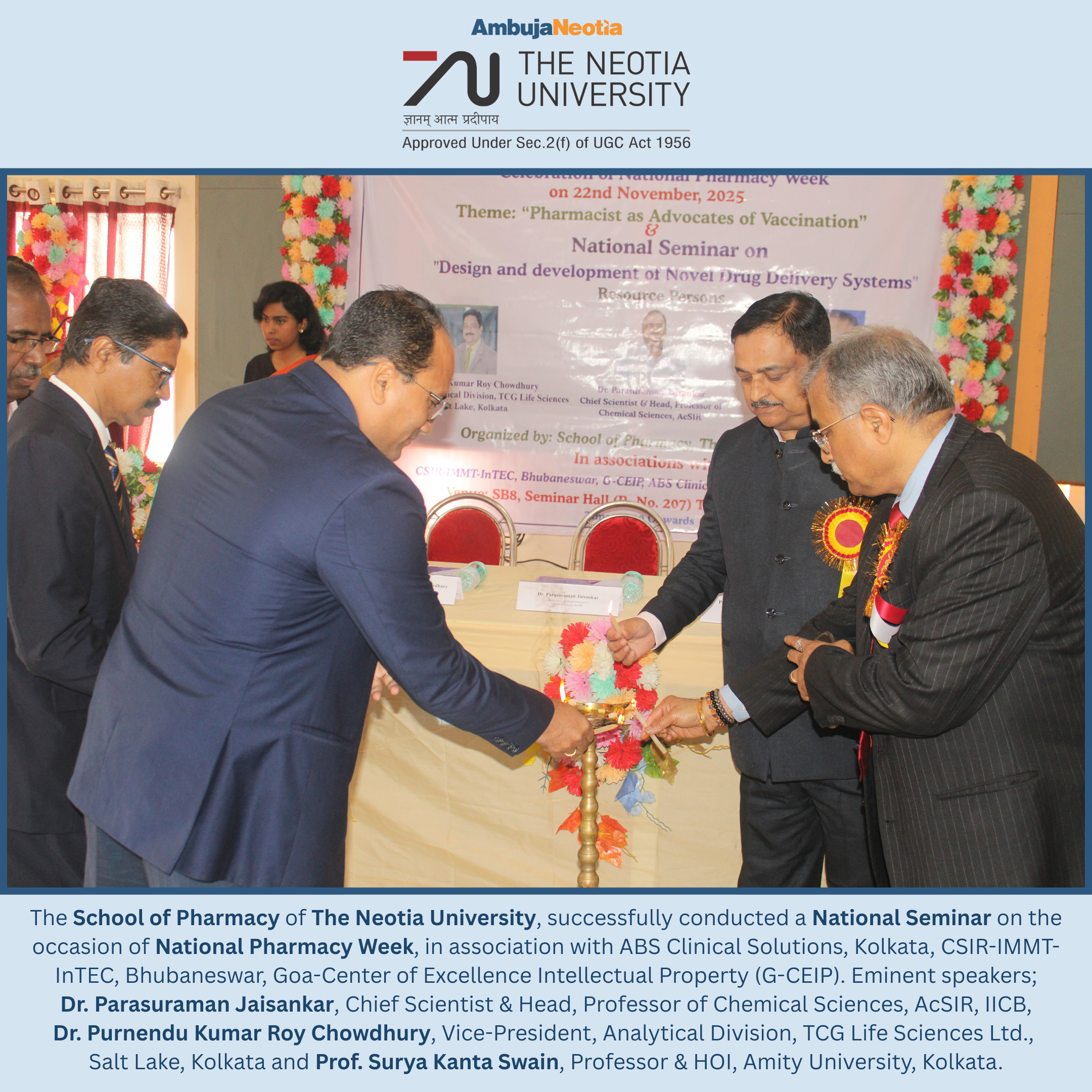 School of Pharmacy, The Neotia University, Sarisha, has successfully conducted a National Seminar on the occasion of National Pharmacy Week, in association with In Association with ABS Clinical Solution, Kolkata, CSIR-IMMT-InTEC, Bhubaneswar Goa-Center of Excellence Intellectual Property (G-CEIP). Eminent speakers; Dr. Parasuraman Jaisankar, Chief Scientist & Head, Professor of Chemical Sciences, AcSIR, IICB, Dr. Purnendu Kumar Roy Chowdhury, Vice-President, Analytical Division, TCG Life Sciences Ltd., Salt Lake, Kolkata and Prof. Surya Kanta Swain Professor & HOI, Amity University, Kolkata.